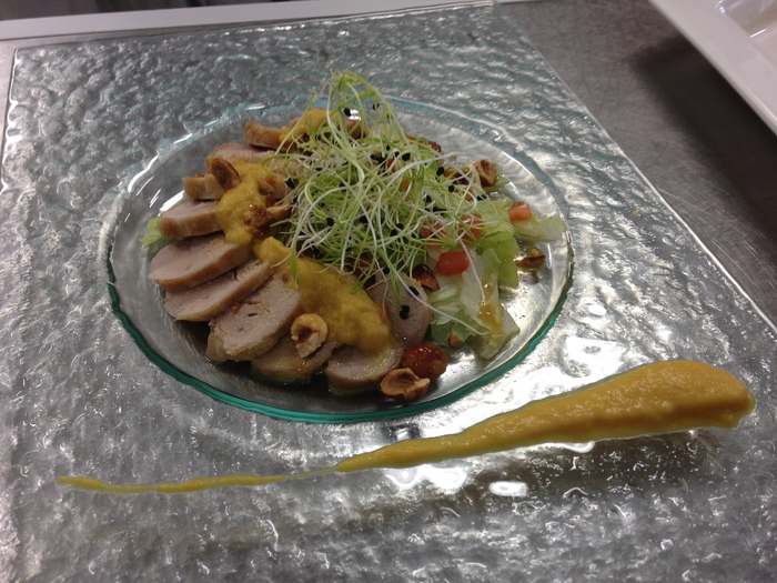 Cortar la codorniz en rodajas.Aliñar la lechuga, los brotes y los tomates cherry con la vinagreta de escabeche en un barreño aparte.Colocar la ensalada en el plato, a un lado extender las rodajas de codorniz y sobre ellas y al lado echar un poco de puré de escabeche. Poner por el plato avellanas garrapiñadas. En el centro poner unos brotes para darle volumen.