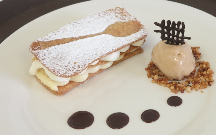-Una vez frío el hojaldre cortar porciones del mismo tamaño y rellenar una capa de crema y otra de nata, disponer sobre la tapa un poco de nata y espolvorear con las esquinas del hojaldre roto