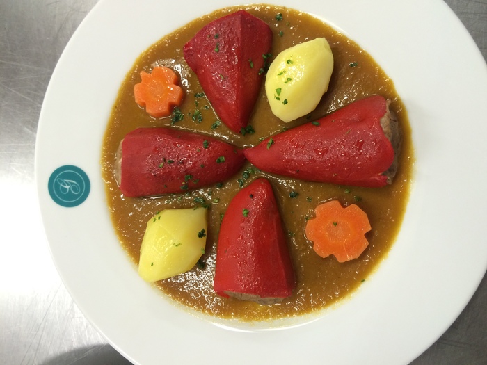 - Salsear el fondo del plato y colocar los pimientos ordenadamente.