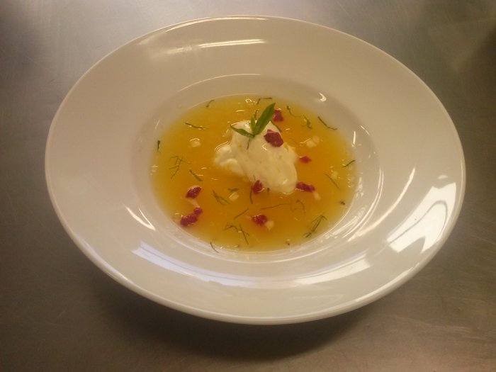 Se coloca una cucharada de daditos de fruta en el centro de un plato hondo. Encima se coloca una quenefa de mousse de chocolate blanco. Se echa la sopa alrededor y se decora con más dados de fruta, la juliana de menta y el aceite de juanolas. Con un microplane sacar ralladura de la piel de cada cítrico y echar por el plato.
