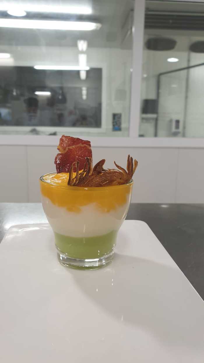 A la hora de emplatar echar en un vasito una capa de cada color y colocar de forma armoniosa una tira de jamón y de alcachofa.