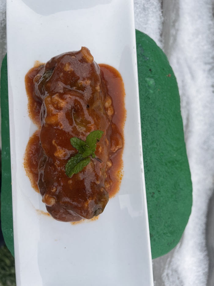 - En crudo, preparar el relleno: poner en un recipiente el arroz (crudo), la carne picada, la cebolla, el tomate triturado, el cilantro, los ajos, la especia baharat, el tomate, y la sal. Mezclar muy bien todos los ingredientes.
